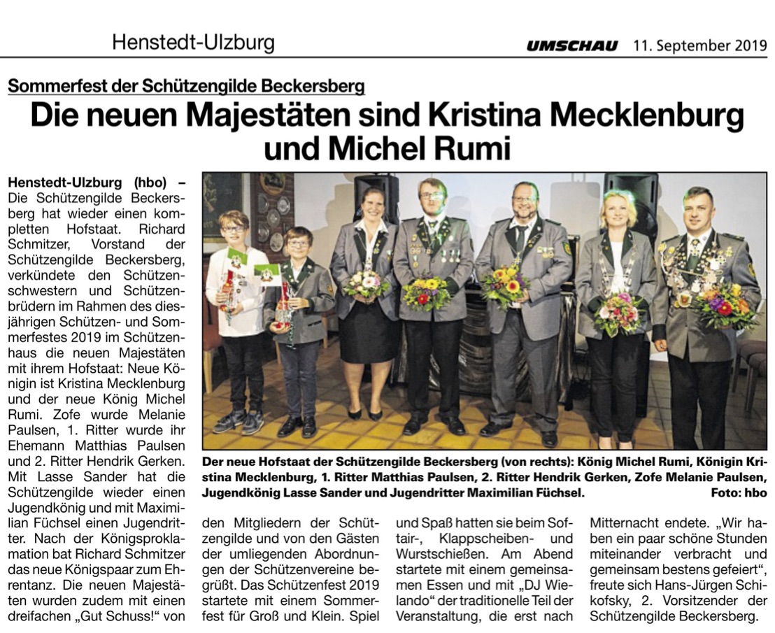 Am 1. September fand in den Räumen der Schützengilde Beckersberg das 61. Schützenfest der Vereinsgeschichte statt. Rund 100 Schützen aus den eigenen Reihen und benachbarten Vereinen, sowie Ehrengäste aus der Gemeinde waren gekommen, um die neuen Majestäten kennen zu lernen. Zu Beginn begrüßte der 1. Vorsitzende Andreas Breezmann die Gäste Bürgermeister Stefan Bauer, den Bürgervorsteher Mariano Cordova, den Fraktionsvorsitzenden der CDU Dr. Dietmar Kahle, die 2. Vorsitzende von Bürger Aktiv Bärbel Witte und den Vorsitzenden von Fortuna U 51 Horst Rohwetter. Von den Gastvereinen war es der Vorstand der Alten Schützengilde Dramburg, von der Schützengemeinschaft Norderstedt König Dirk und die 1. Zofe Inge, die Schützengilde Goldener Hahn Stuvenborn, von der Schützenkameradschaft Schmalfeld König Ralf und Königin Sandra, eine große Abordnung des Schützenvereins Kaltenkirchen mit der 1. Vorsitzenden Frauke Heering-Wittorf und vom Sether Schützenverein König Andreas mit Gefolge.